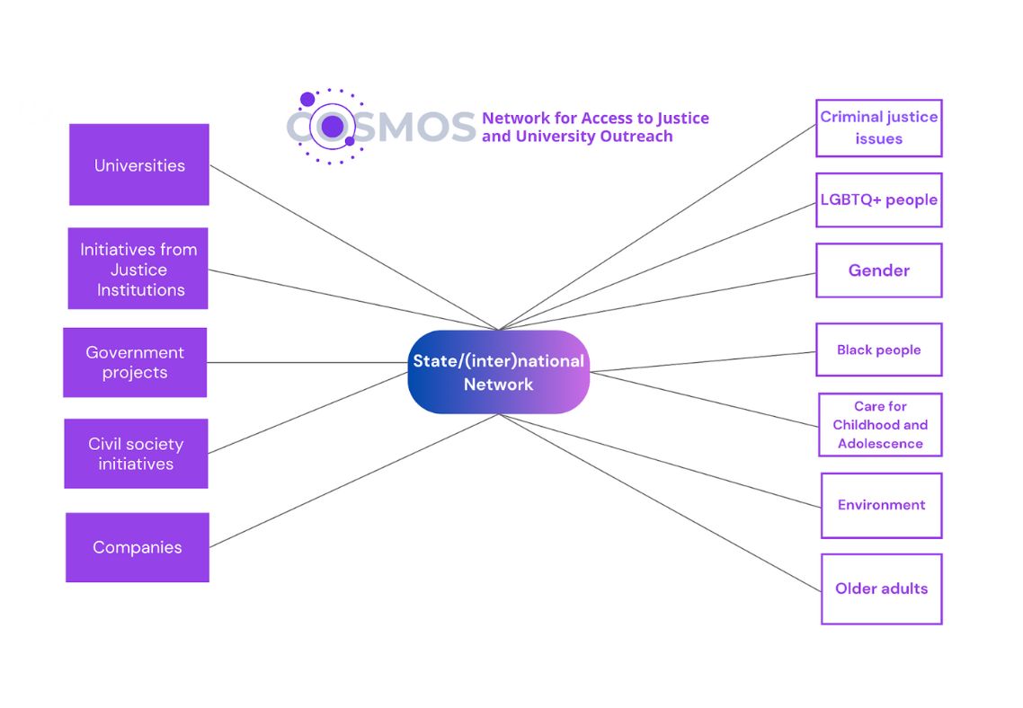 Fortifying an inclusive and innovation-oriented culture of university extension contributes to attracting investments, enhancing the university’s social legitimacy, and encouraging the development of scalable solutions to major contemporary challenges. Inspired by these demands, Cosmos: Network for Access to Justice and University Outreach emerges as a social platform that connects civil society with the university and other strategic actors who, in traditional contexts, tend to remain invisible or underutilized. However, the most significant transformation enabled by this model lies in its potential to expand students’ formative horizons — as central protagonists of this ecosystem — by highlighting multiple pathways for innovation and the reconfiguration of academic, professional, and institutional practices. By expanding its network-driven engagement, the university increasingly educates and sends into the world professionals who are better prepared to address complex challenges, operate in interdisciplinary contexts, generate measurable social impact, and contribute to the development of sustainable, inclusive, and common-good–oriented solutions.