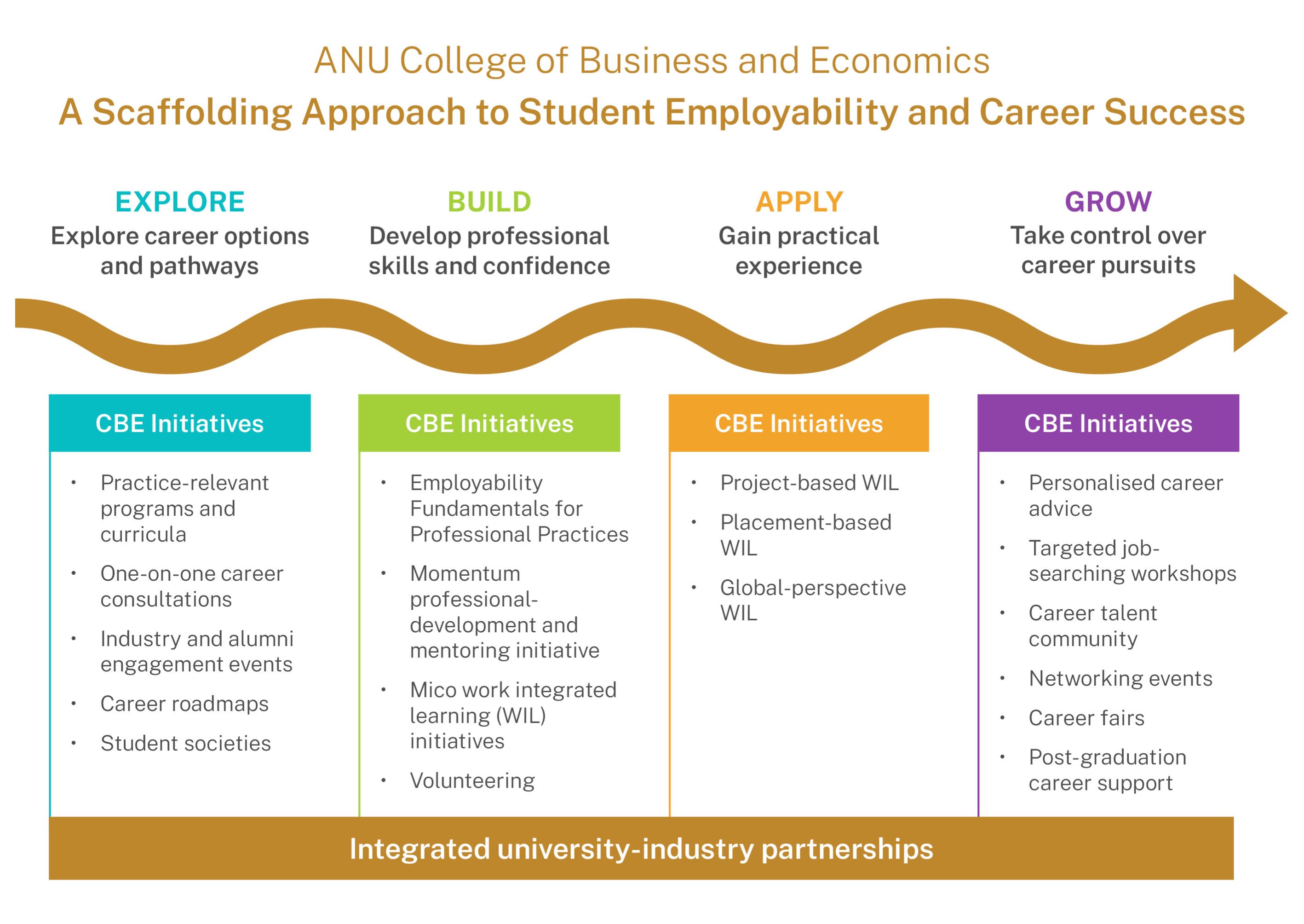 The College of Business and Economics (CBE) at The Australian National University (ANU) exemplifies how to address the challenges of preparing graduates for a dynamic job market by adopting a scaffolding approach to student employability and career success in close partnership with employers (as illustrated in Figure 1). Informed by Vygotsky’s theory of scaffolding (1978), this approach provides structured support, with increasing complexity and authenticity, that gradually enhances students' employability skills and confidence, enabling them to successfully navigate their career development journeys. Its success has contributed to the University’s ranking as 1st in Australia and 30th in the world for graduate employability in the Times Higher Education Global University Employability Ranking 2025.